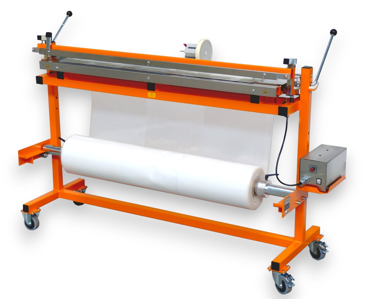 Svetsar exempelvis bred slangfilm med invik i sidorna för tillverkning av måttanpassade pallhuvar. Står på golvstativ med låsbara hjul och kan lätt flyttas till olika arbetsområden.